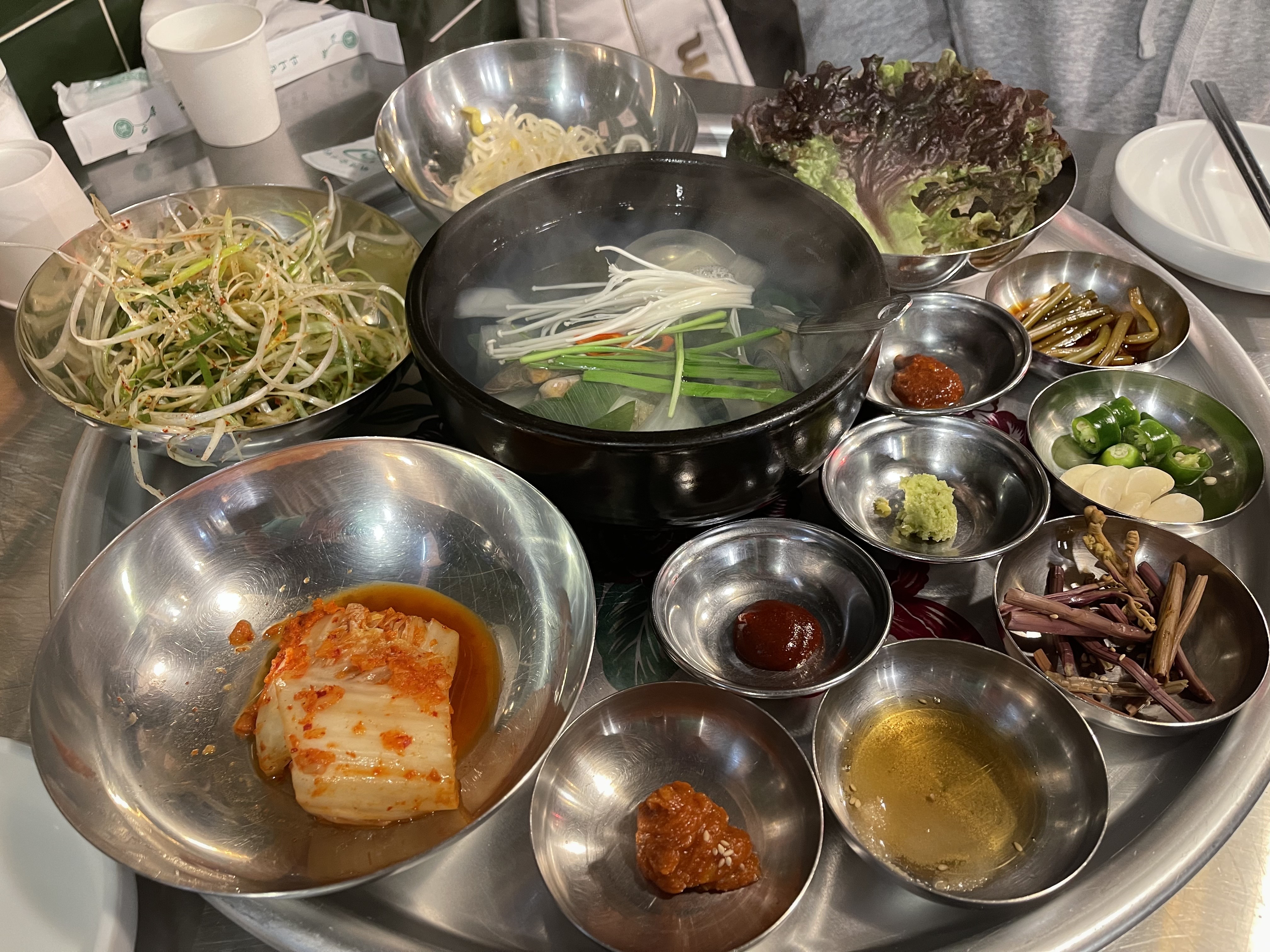 기본반찬을 이렇게 쟁반에 담아서 줘요. 야채는 고사리, 파채, 콩나물, 김치 다양하게 있고, 소스도 참기름 소금, 고추장, 와사비, 쌈장, 특히 맛있어던 갈치 속젓까지 다양하게 있었어요. 소스가 다양해서 먹을때 재밌었던거 같아요.