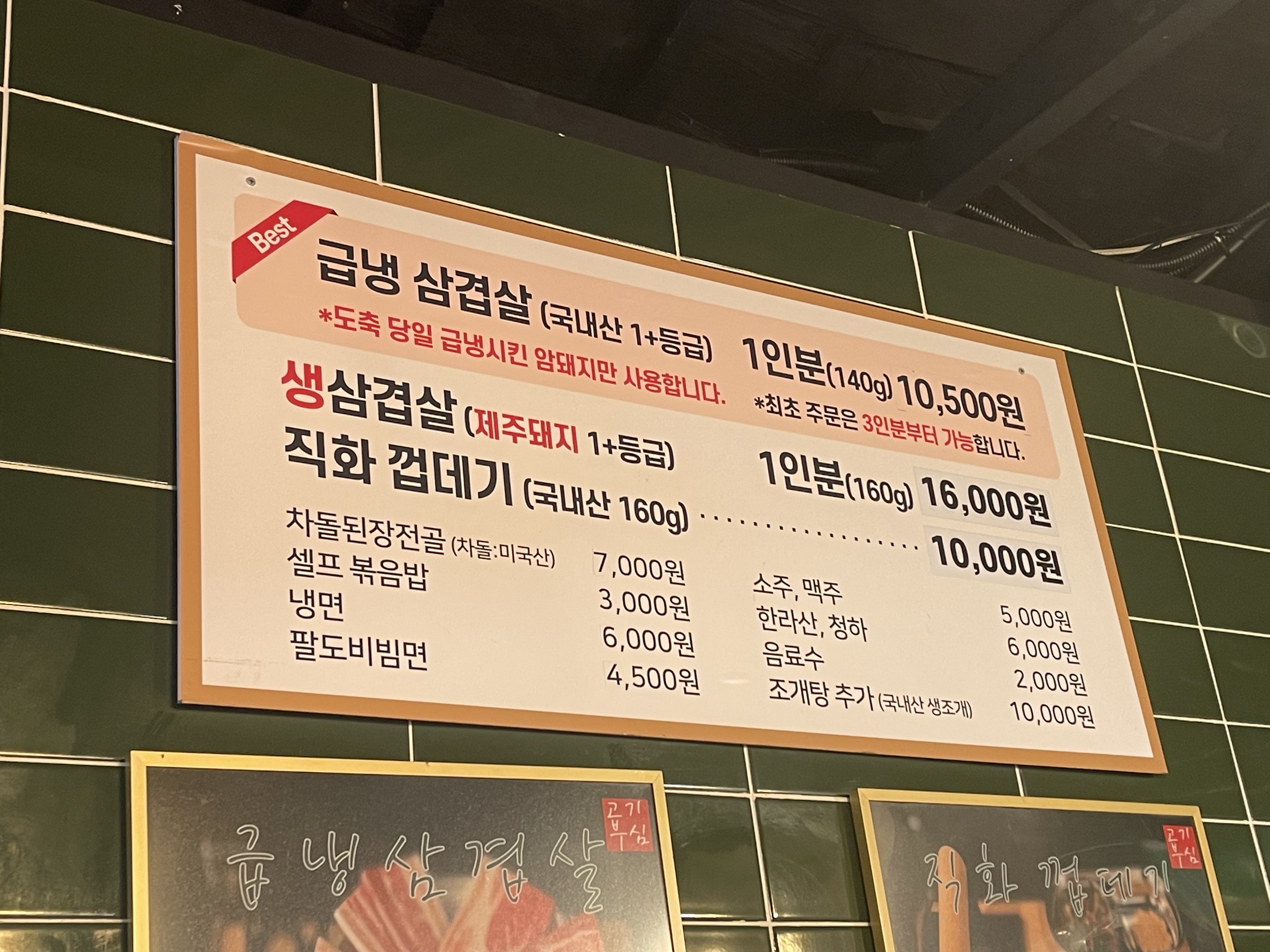 한강돼지집 메뉴판이에요. 저와 여자친구는 급냉삼겹살을 시켰는데요, 최소 주문이 있어 3인분을 시켰어요. 3인분이 둘이 먹기 적당했던거 같아요.