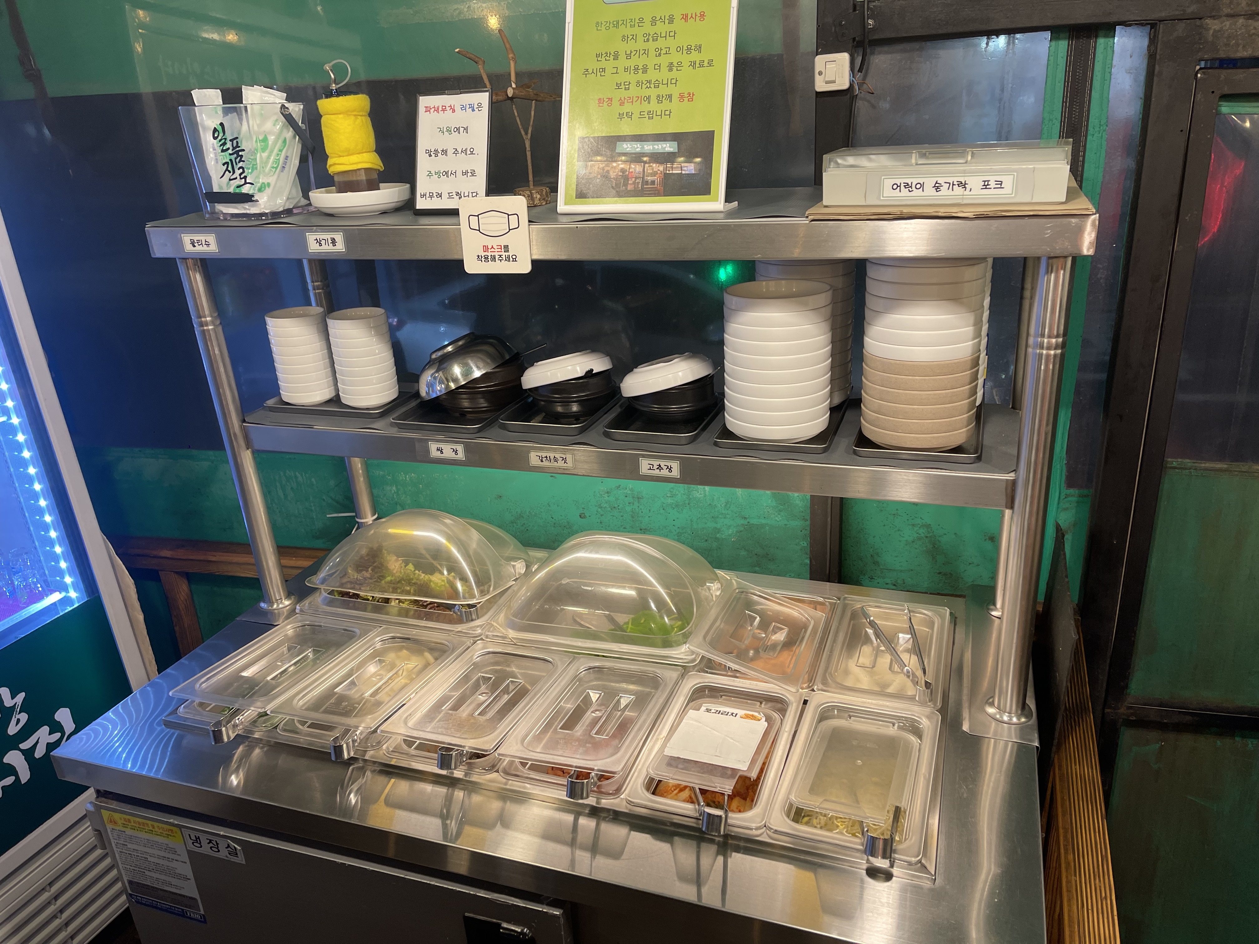 오늘은 술을 안먹어야 겠다고 다짐했지만... 얼큰한 조개탕과 삼겹살의 공격에 못이기고 소주한병을 주문했습니다. 한강돼지집은 술과 반찬이 셀프로 운영돼고 있어요.