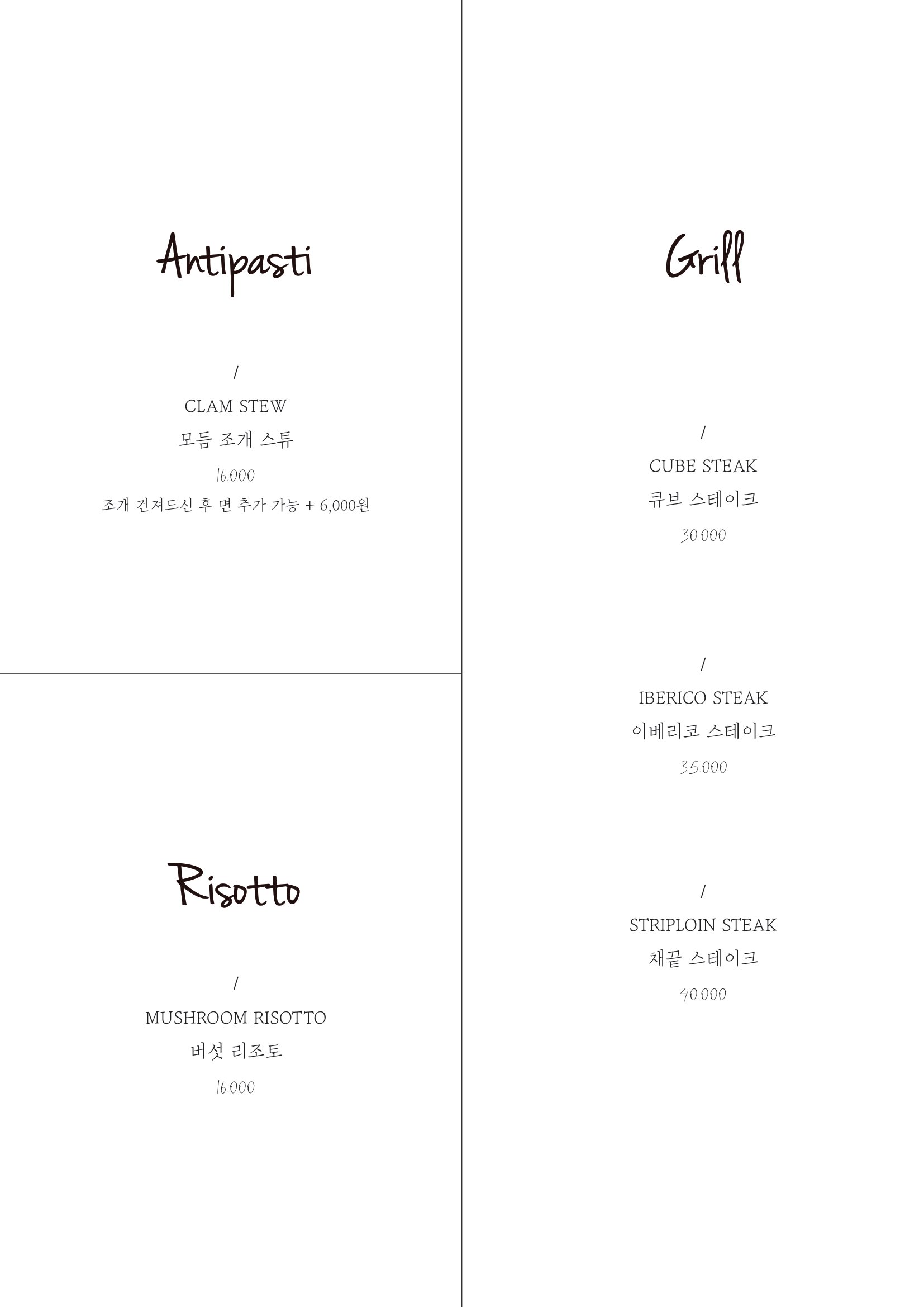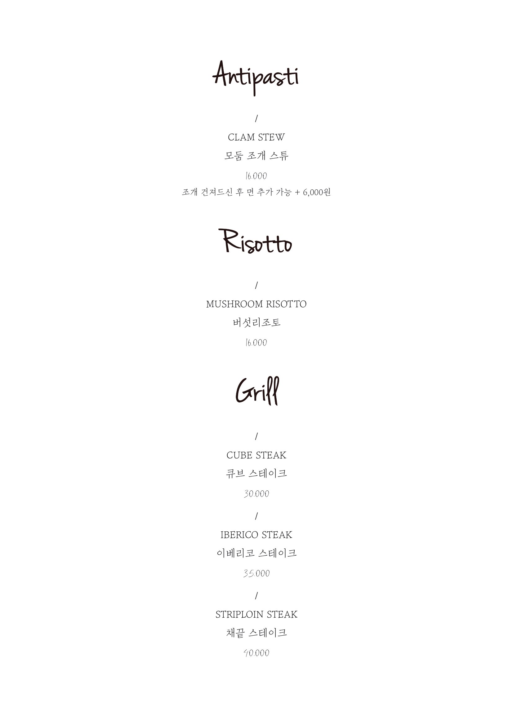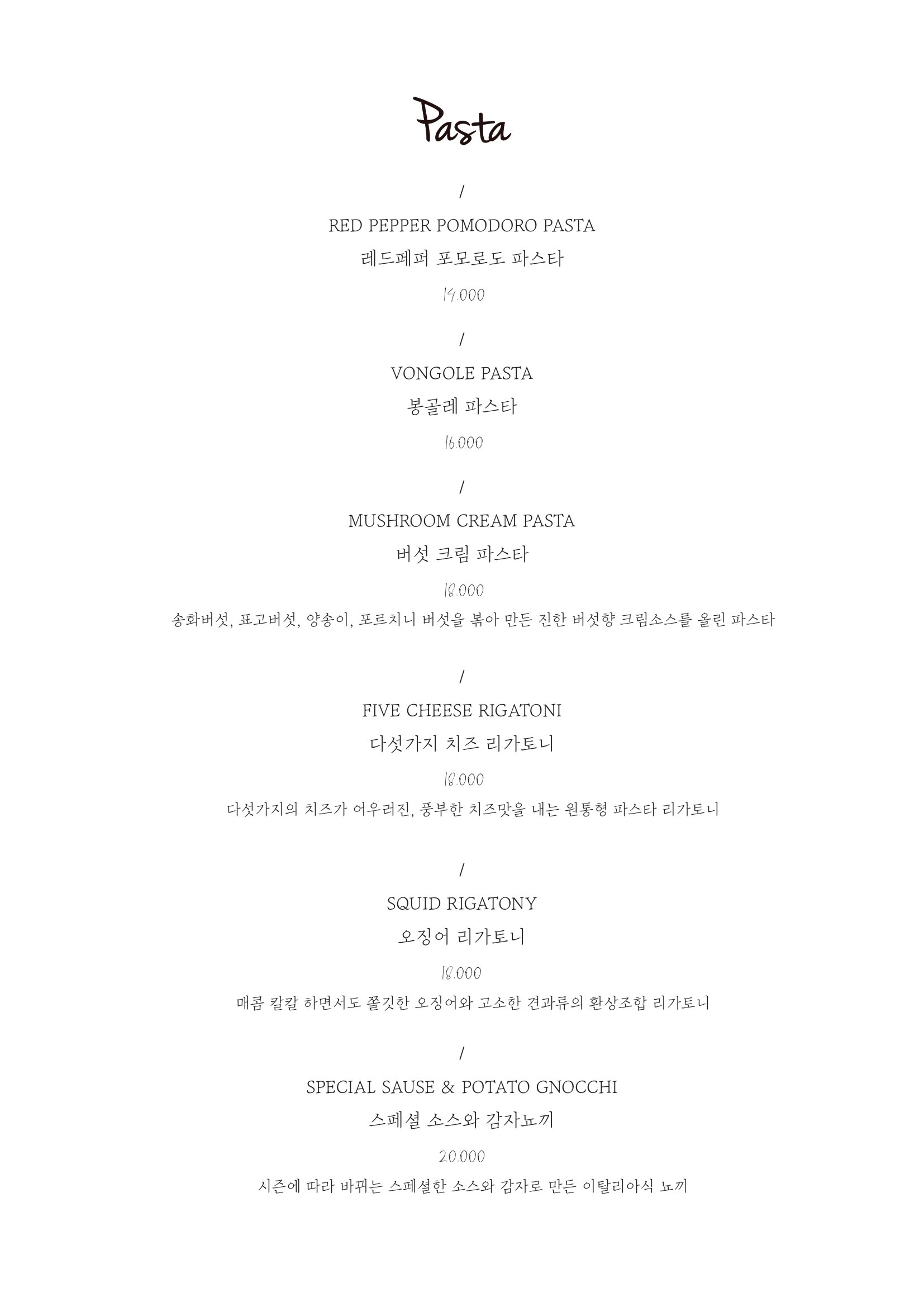 저희는 오늘의 메뉴(위 메뉴판에 없음)였던 우렁된장 파스타(18,000원), 감자 뇨끼(20,000원), 이베리코스테이크(35,000원)을 시켰어요.