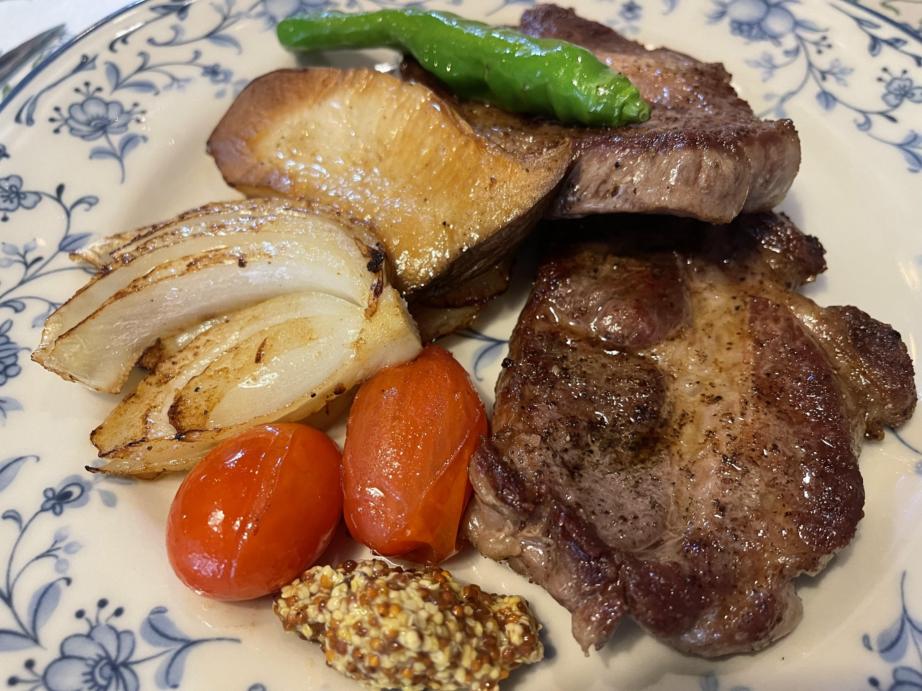 마지막으로 나온 이베리코스테이크에요. 스테이크는 돼지 목살 스테이크였고 고기는 숙성시켰는지 부드러웠어요. 같이 나온 양파, 버섯, 토마토, 고추도 고기와 잘 어우러졌습니다.