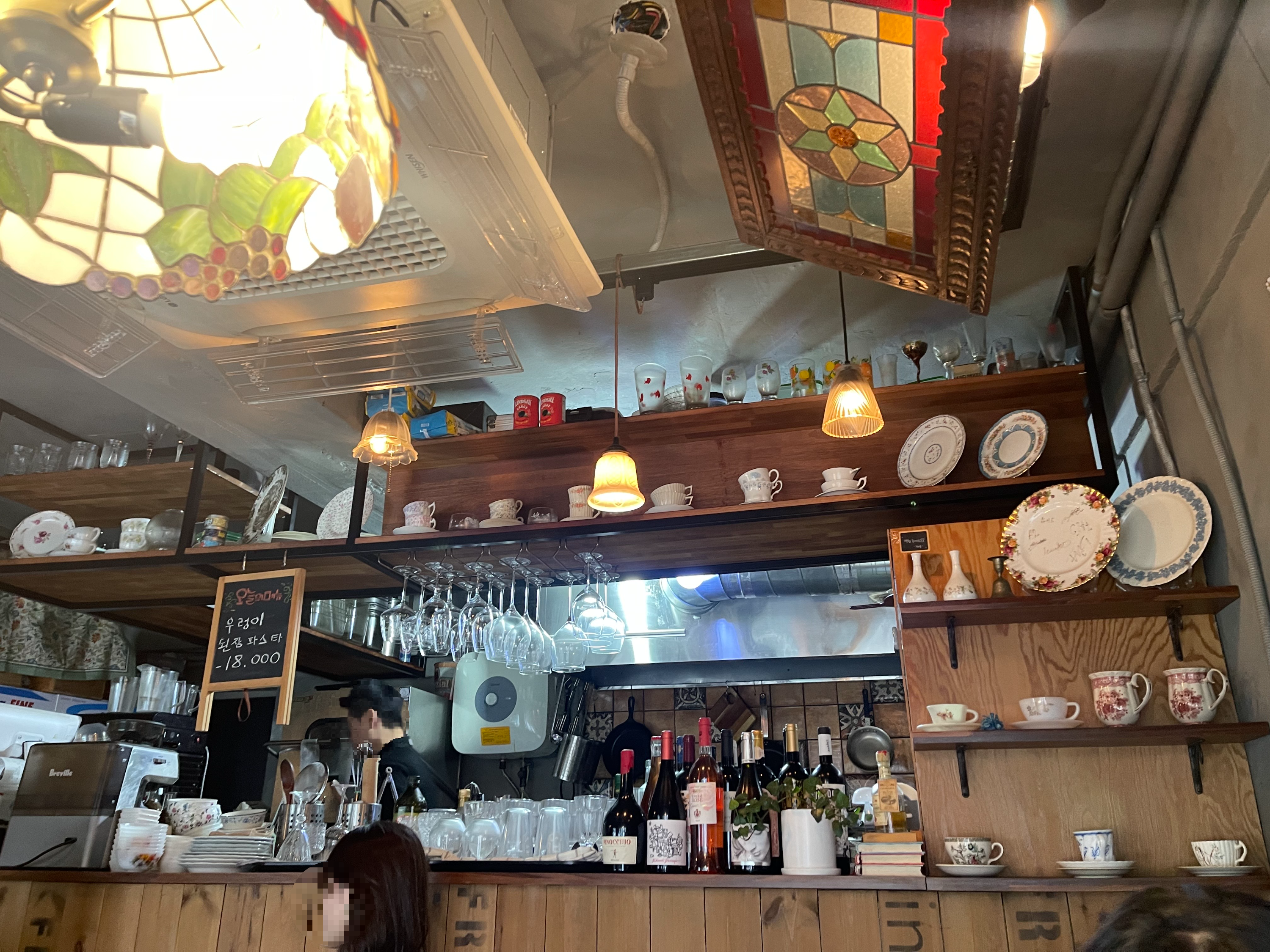 매장내부 사진이에요. 매장내부에 테이블은 세개가 있었어요. 박쉐프님? 혼자 운영하셔서 그런지 테이블 수가 적었어요. 예쁜 컵들과 그릇이 장식되어 있었고 특히 스테인글라스 그림과 천장 조명이 특이했어요.