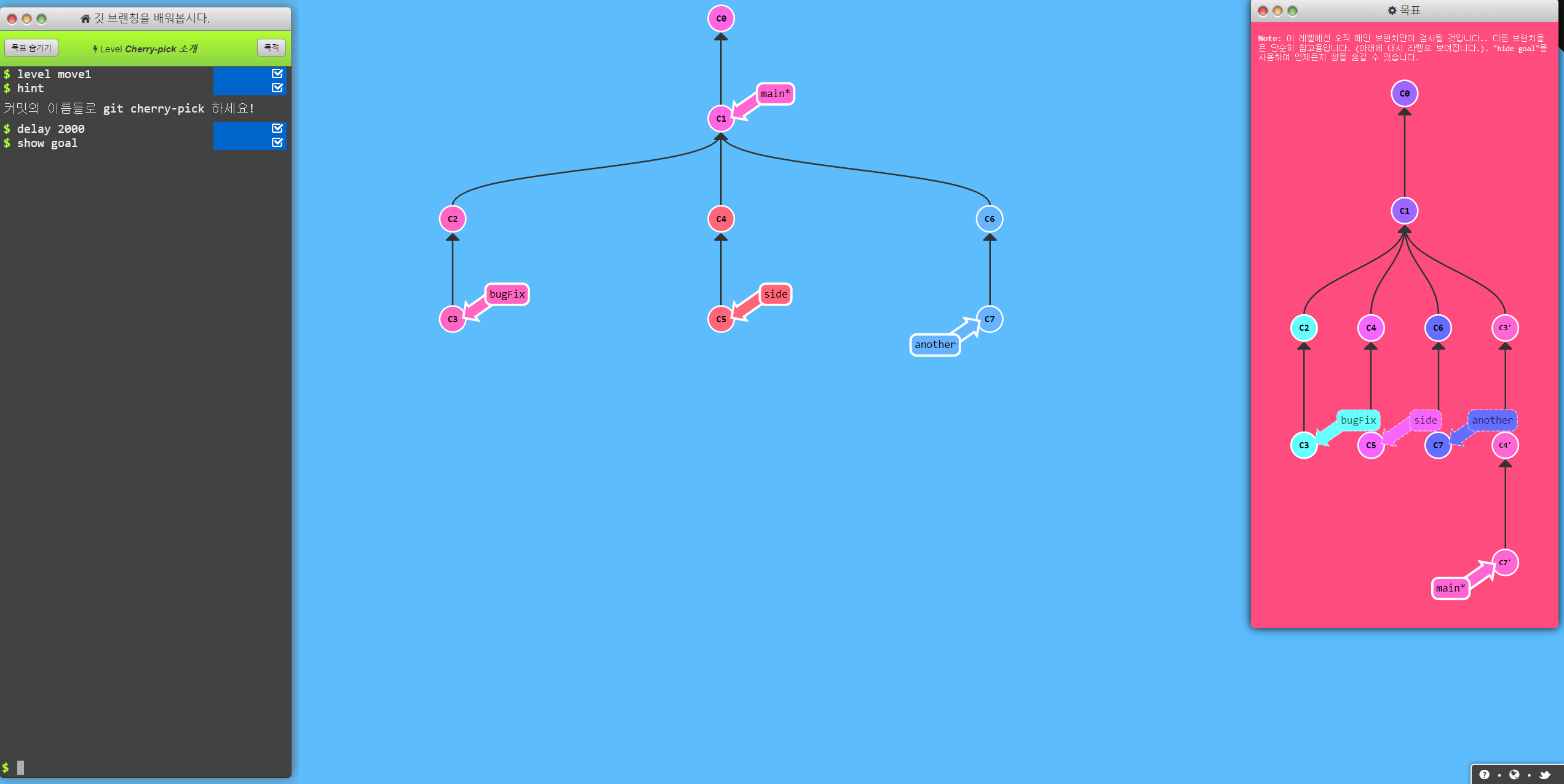 위에 보시는 화면이 사이트 화면입니다. 가운데 파란색 배경이 현재 branch 상태를 나타냅니다. 오른쪽 빨간화면이 git 명령어로 만들어야할 최종 목표입니다. 왼쪽에 명령어를 입력하셔서 최종목표 상태로 만들면 됩니다.