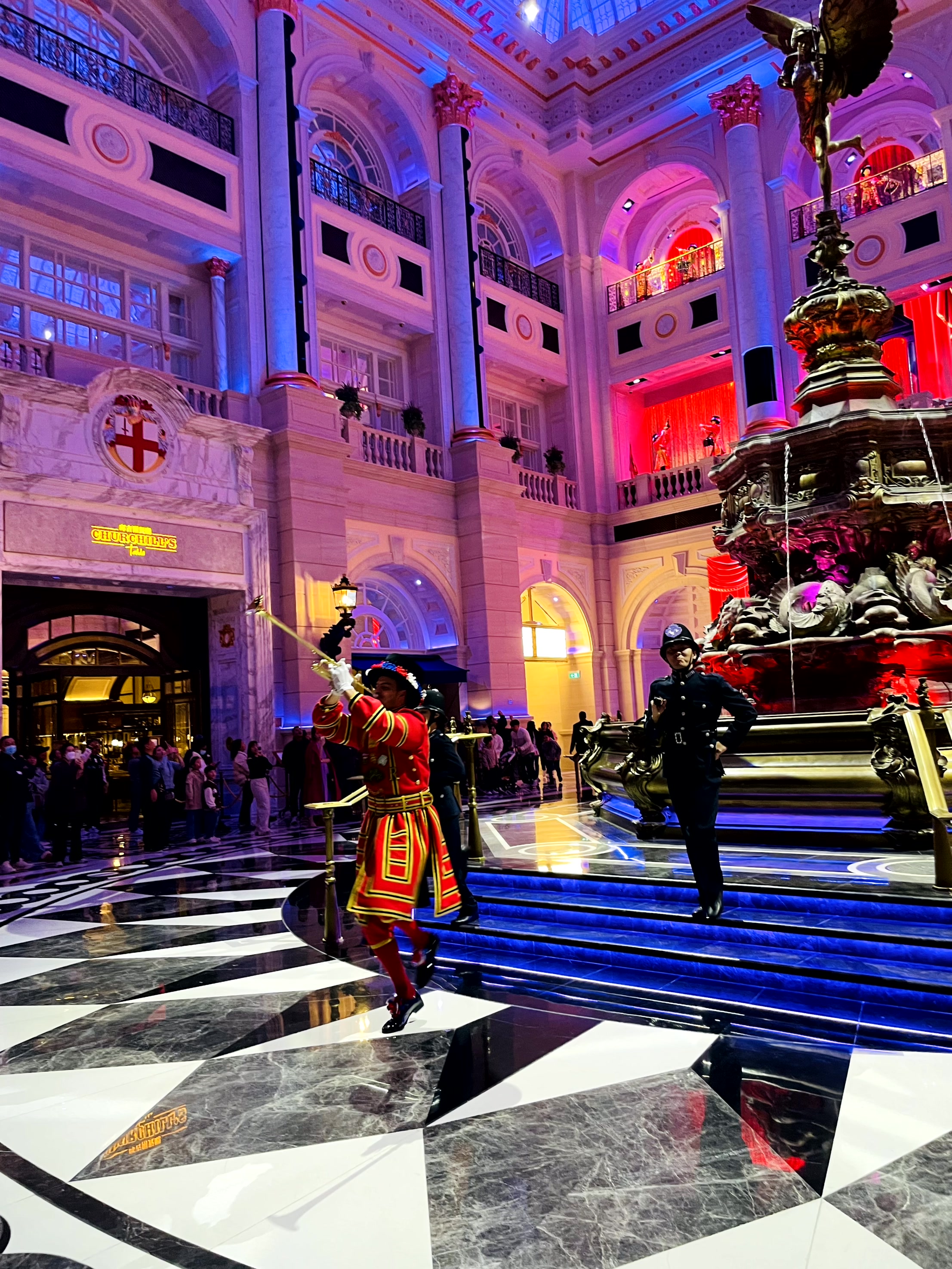 런더너 호텔에서는 특정 시간마다 근위병 교대식을 진행하고 있어요. 위의 사진 왼쪽에 보시던 분수가 있는 로비에서 진행돼요. 갑자기 불이꺼지고 2층과 3층 문이 닫히며 여왕님이 나오세요. 그리고 근위병 3명이 나와서 들려오는 노래에 맞춰 흥겹게 춤을 추신답니다. 관객 근처로 와서 하이파이브를 하는 등 흥이 많으셔서 저도 덩달아 신이 났어요.