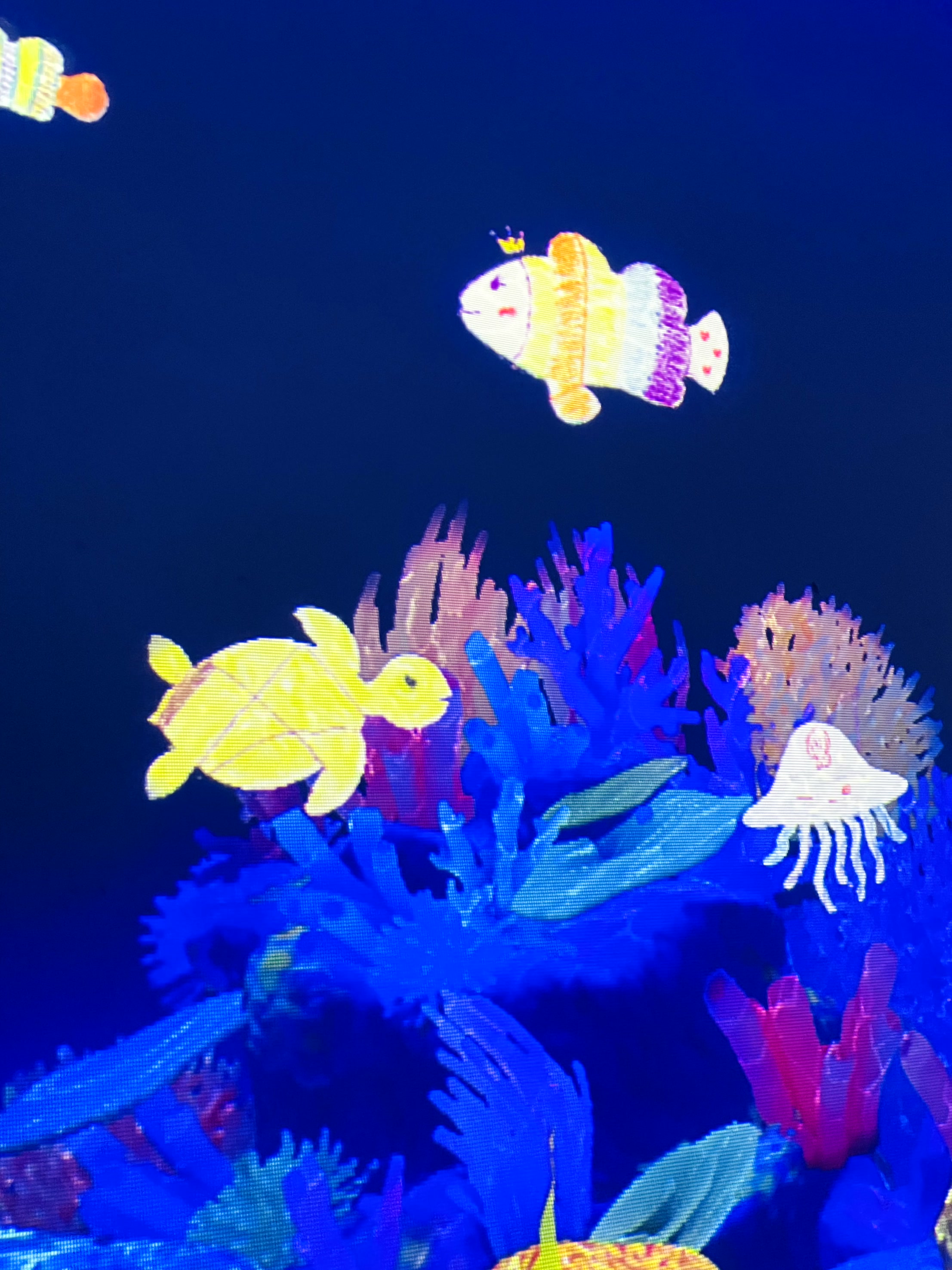 이렇게 물고기를 직접 그려서 직원분한테 드리면 화면속 들어가 헤엄치는 모습을 볼 수 있어요.