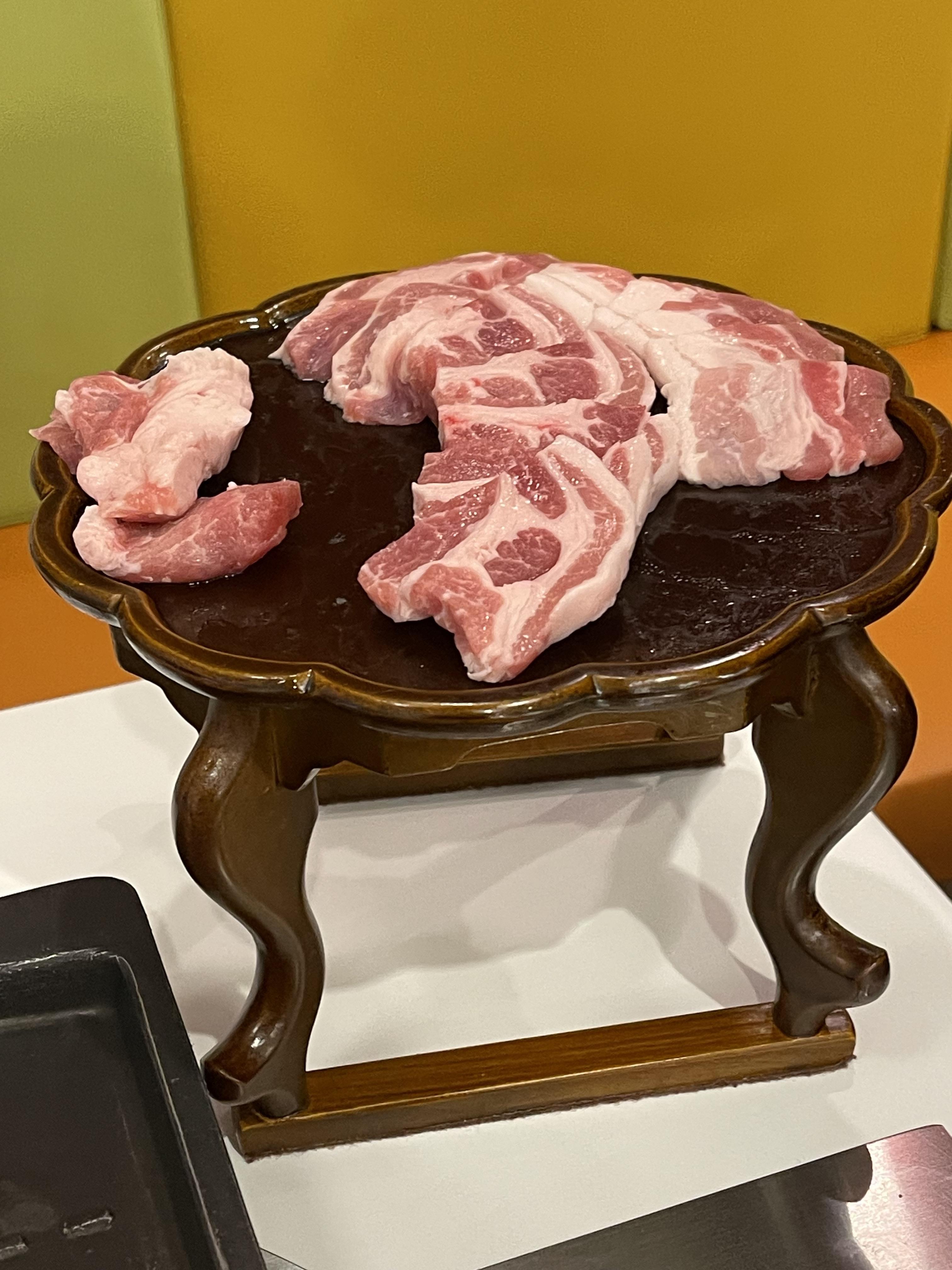 우리한판을 시켜서 불판에 올린 모습이에요. 먼저 소반위에 고기 한판이 나왔는데 처음보는 모습이라 신기하고 창의적이었어요.