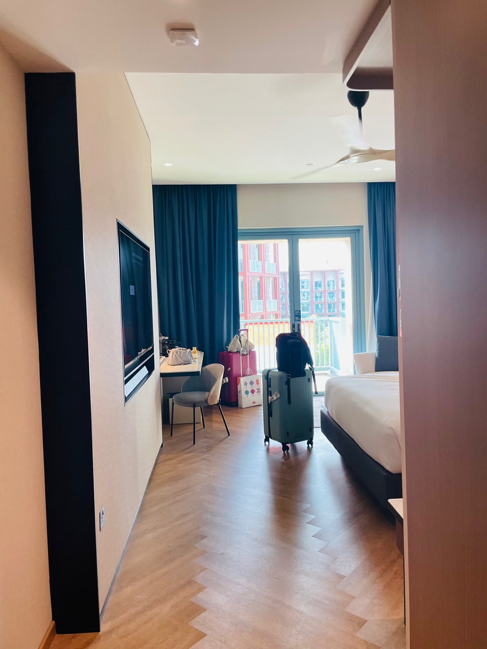 방에 들어가자마자 찍은 사진인데 내부가 꽤 넓었습니다. 바깥 뷰는 옆 호텔 뷰였는데 건물이 귀여워서 괜찮았던걸로...